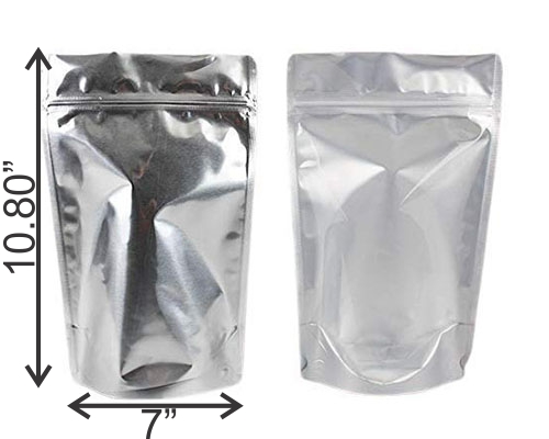 For those requiring a larger capacity without compromising on presentation, our 7x10.80 inch silver standup pouch is the perfect fit, designed to comfortably hold up to 500 grams (approx.). This large metallic resealable food bag is an excellent choice for packaging bulk quantities of dried fruits, premium grains, baking mixes, or various powders.