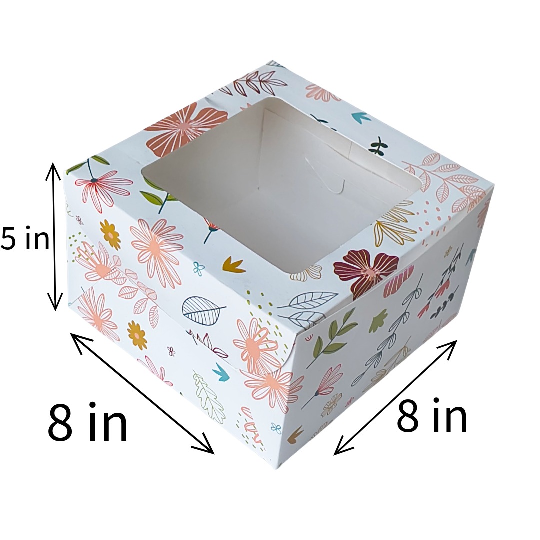 8''X8"X5" Floral design Window Cake box With Elaborated space inside to fit Half kg designed and non designed cakes. Maximum Square shape window to show your culinary creations & Cake designs. Kraft virgin paper made which comes in Flat design for easy transportation. Recyclable and Eco Friendly. Easy to assemble space saving and stackable.