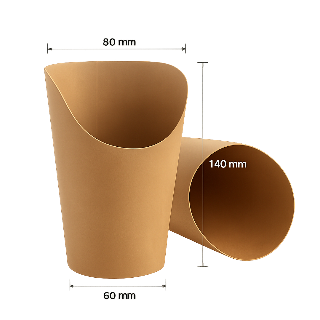 Present your snacks, fries with style and eco friendliness with our Premium Kraft Paper French Fry cups. Constructed with a tall back profile and tapered base, these eco-friendly paper holders are 80 mm top diameter, 140 mm height, and 60 mm bottom diameter which is great for fries, wedges, waffles and finger foods. Made from durable high strength coated kraft paper, these paper cones offer excellent grease proof properties while maintaining a natural finish and colour that is ideal for eco sensitive cafes, food trucks, and takeout counters. The open top design allows easy filing and mess free eating for customers. These fries cups are compostable and biodegradable which makes them a great choice for businesses that are trying to reduce plastic waste without compromising practicality and ease.