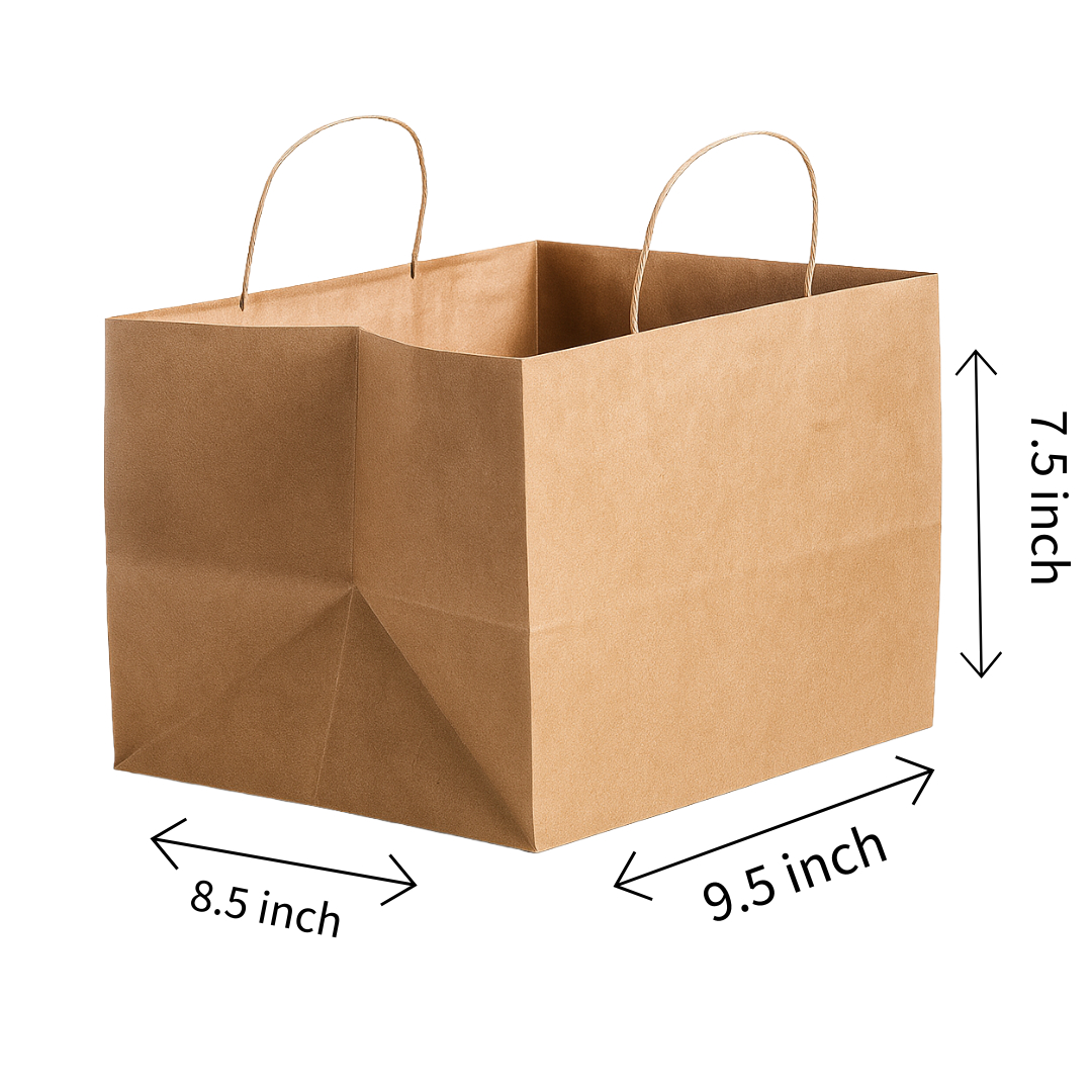 For reliable food packaging, choose Restokart's Kraft Paper Bags for Smaller Cake Boxes | 9.5x8.5x7.5 Inch. These medium-sized paper bags are a practical and eco-friendly solution for bakeries, cafes, and cloud kitchens. They are ideally sized for smaller cake boxes, single meal takeaways, or a selection of bakery items, ensuring a secure and presentable delivery. Crafted from strong Kraft paper, they offer excellent stability. These are your go-to for wholesale paper bags for food.