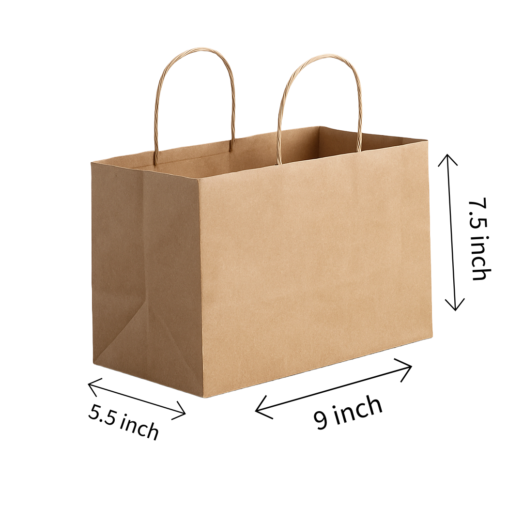 Deliver your smaller items and orders beautifully with Restokart's Small Kraft paper Bags with Handle 9x5.5x7.5 Inch. These compact yet charming eco-friendly paper bags are perfect for snacks, small orders, bakeries, or for personal use when packaging thoughtful presents. Made from natural brown kraft paper, they offer a classic, rustic appeal and support your brand's commitment to sustainability. Find these ideal wholesale paper bags for charming presentations.