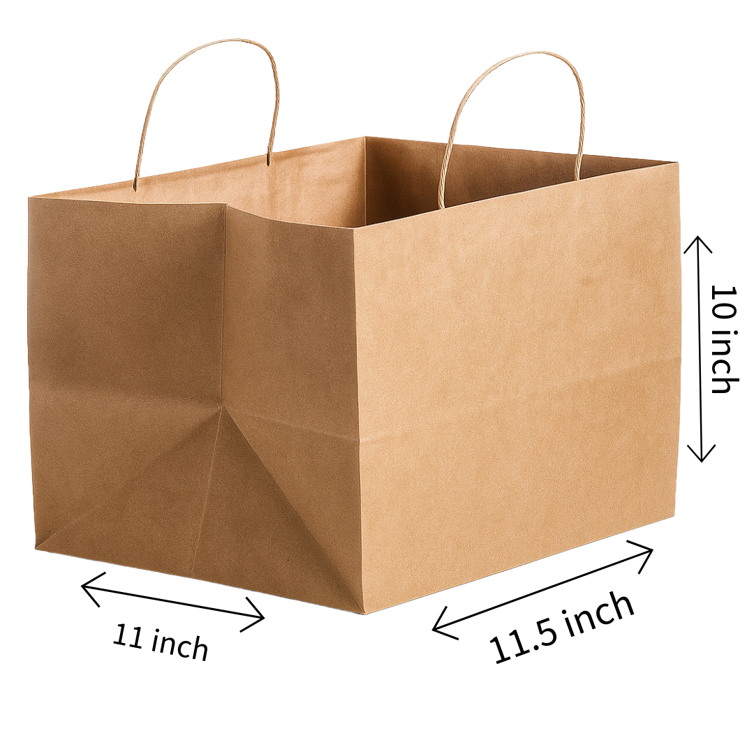 Secure your bakery delights and wide items with Restokart's Square Kraft Paper Bags for Cake Boxes | 11.5x11x10 Inch. Specifically designed for items requiring a wider, stable base, these unique square-bottom paper bags are perfect for cake boxes, large gift boxes, or bulkier retail products. Made from resilient brown kraft paper, they combine superior strength with an environmentally friendly profile. Source your wholesale paper bags for specialized packaging from Restokart.